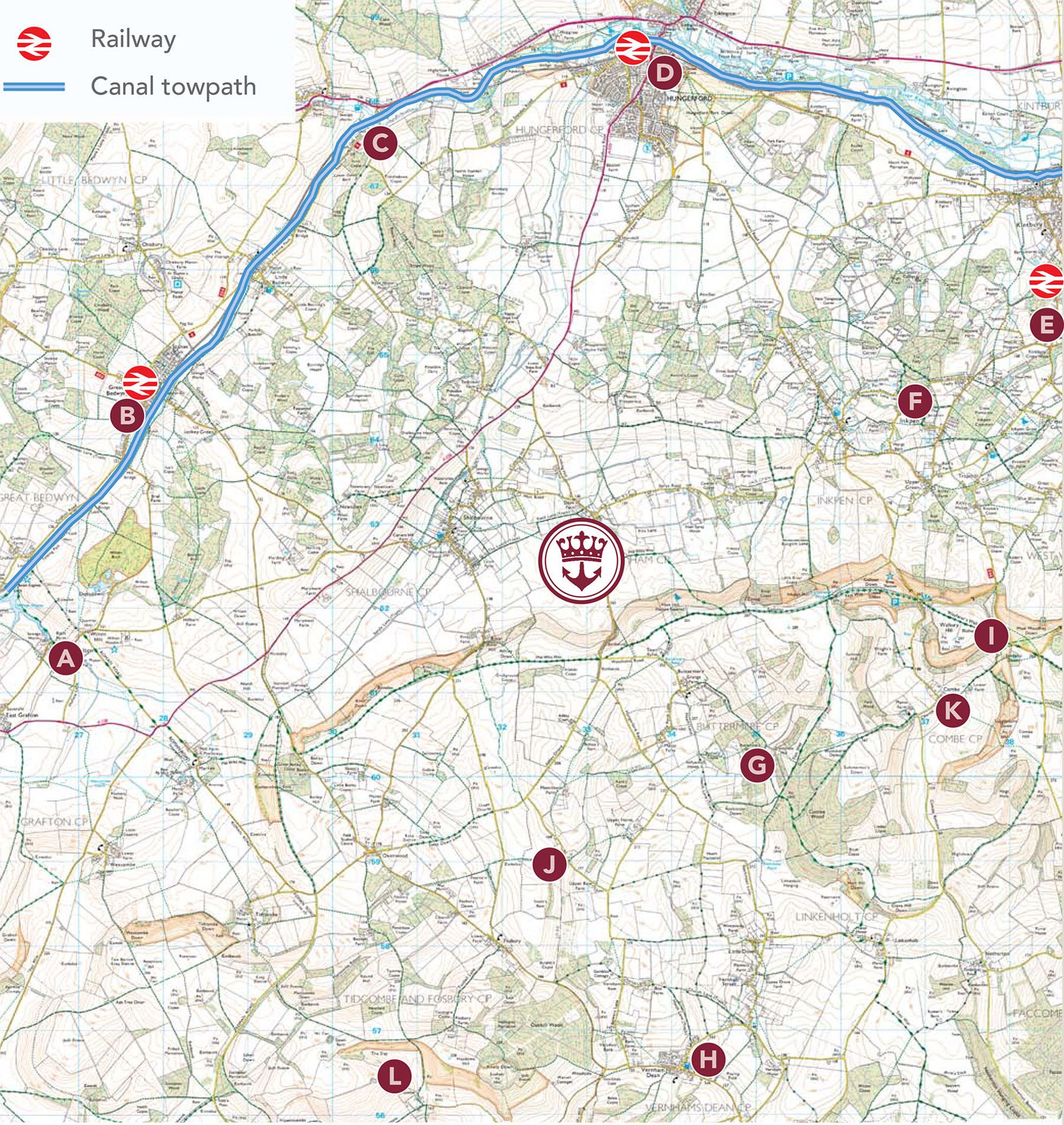 Walks 14-18 can be considered either as circular routes, or as alternative ways of covering a stage on a walk linked by the railway or the towpath of the Kennet & Avon Canal. Find out more.